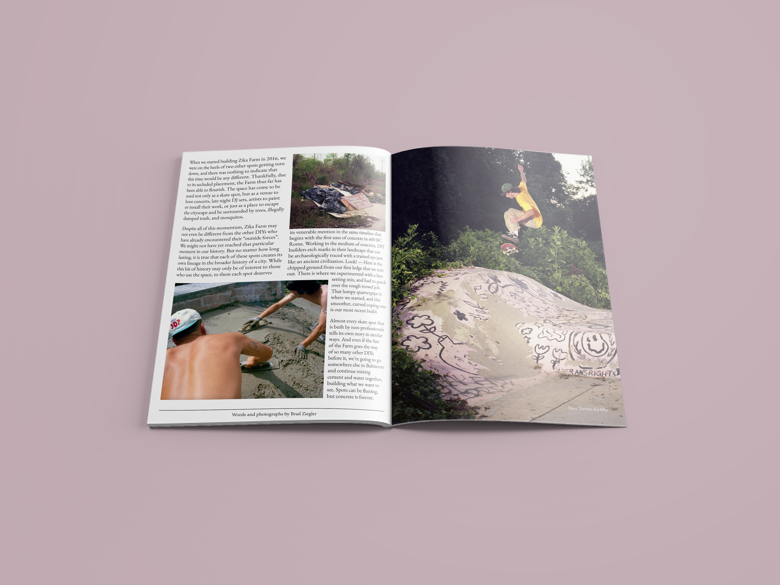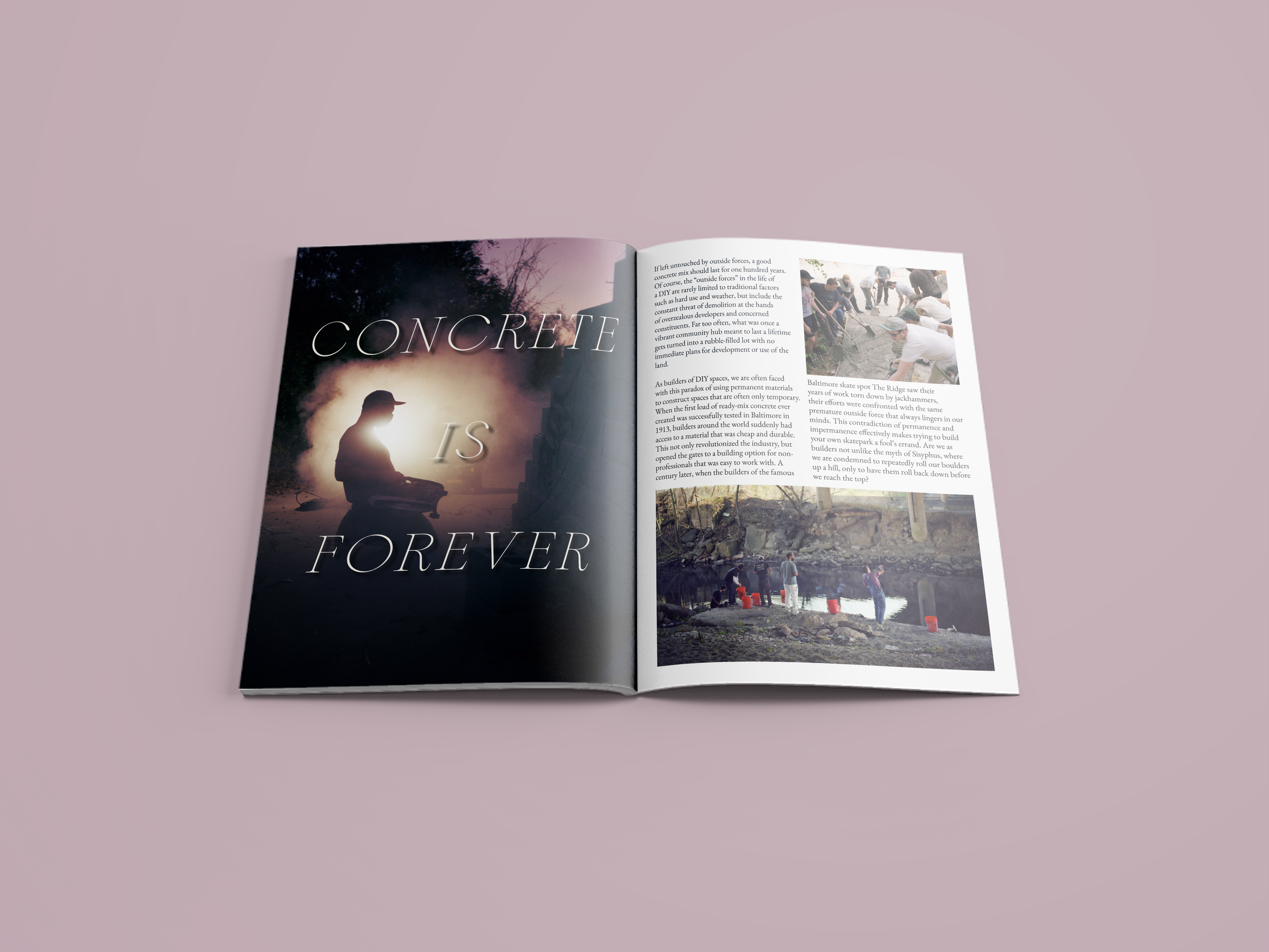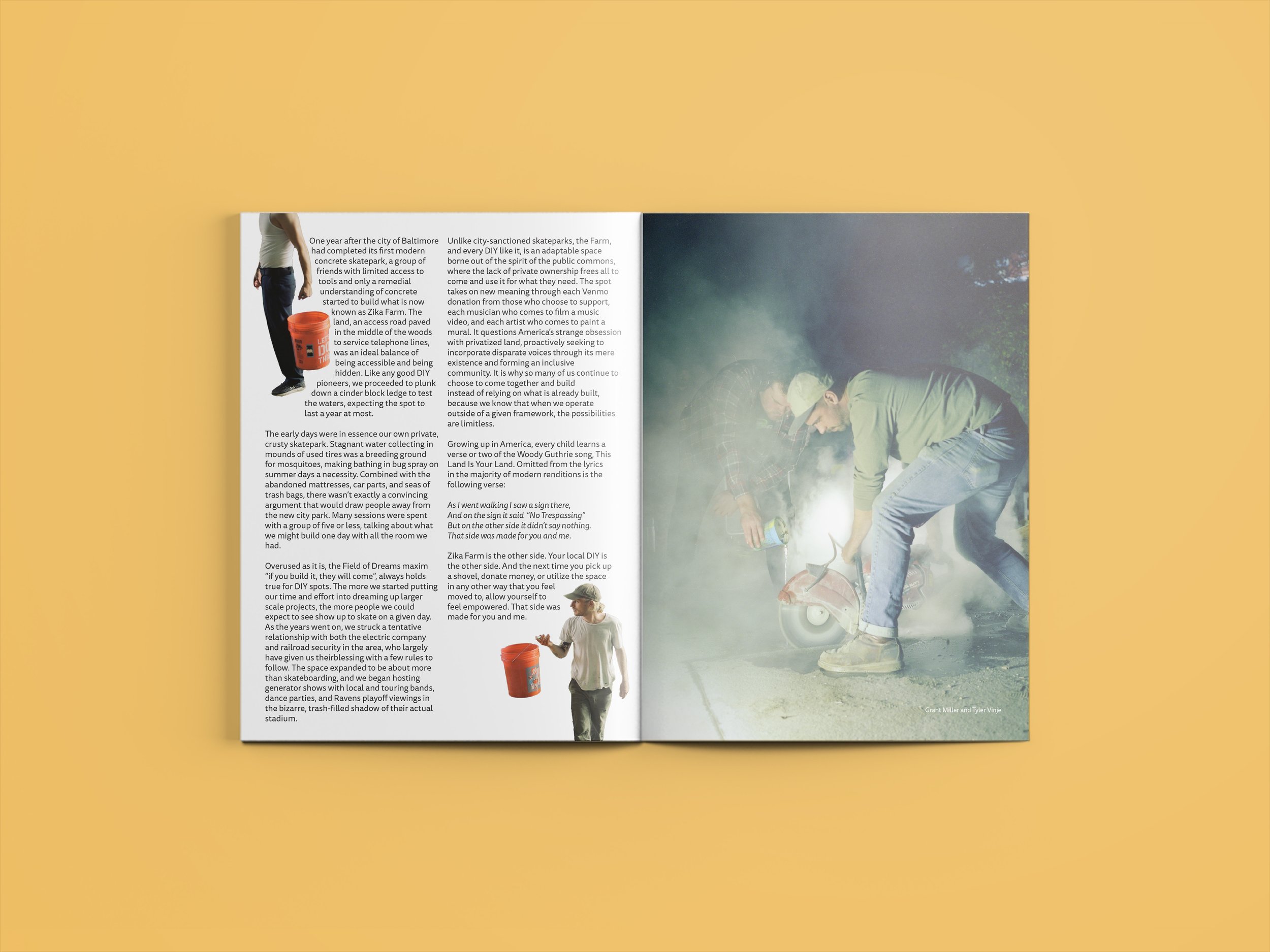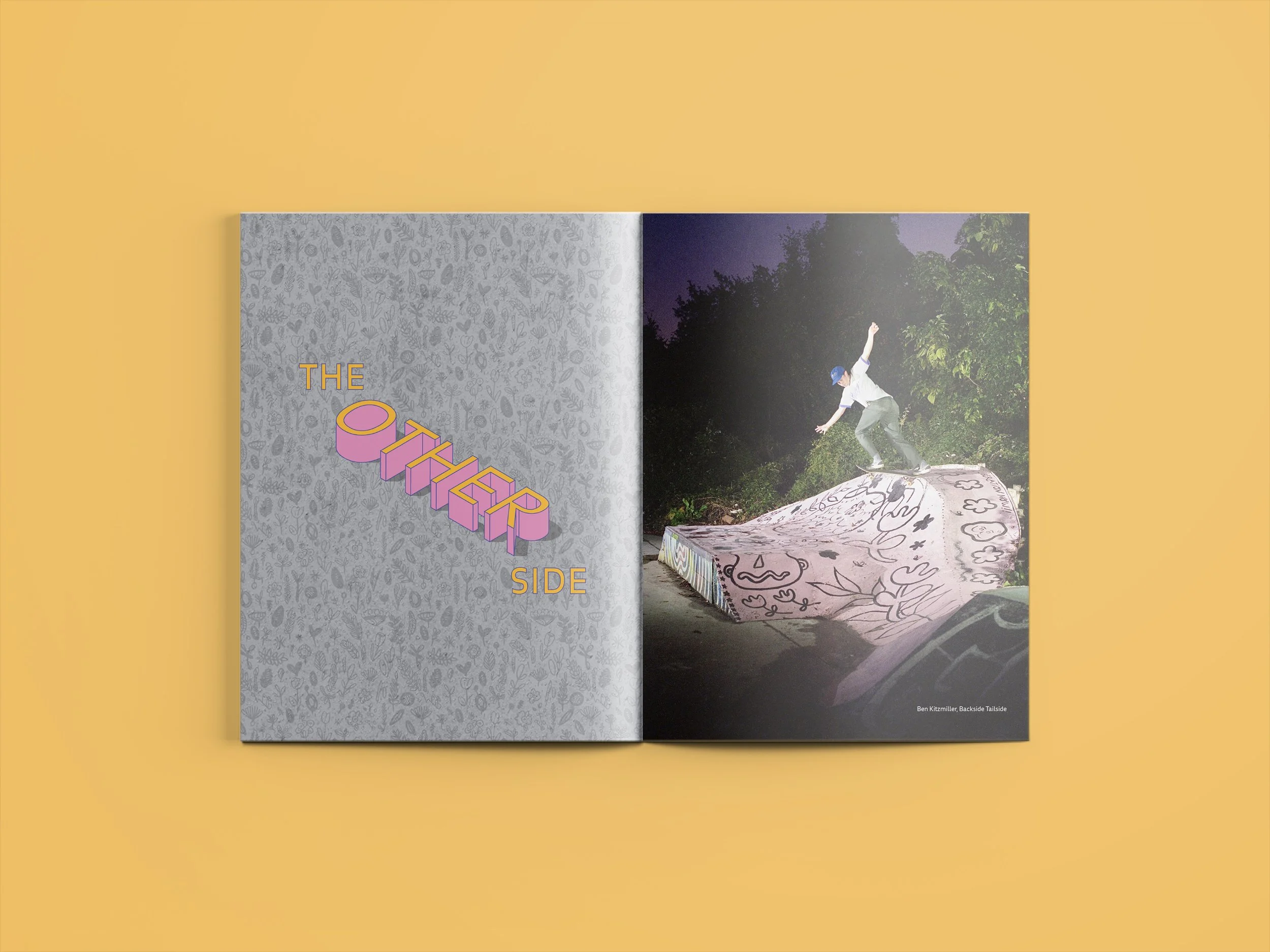 For this layout, I captured the park’s visual essence through doodle-style sketches underneath a clean typeface, drawing a parallel with the finished obstacle’s graffiti on the facing page. The following pages deconstruct this finished piece through images of the building process.